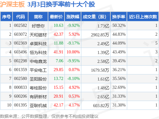 当日沪深主板换手率前10大个股中6只个股收涨aj九游会官网,平均涨幅4.27%,其中好思你(002582)以换手率50.32%排第一,5只个股近5个往异日中屡次上榜。