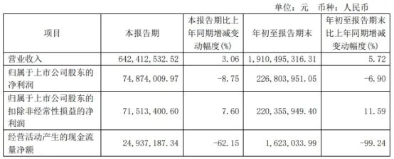 应流股份昨晚暴露的2024年第三季度阐彰着示,公司前三季度罢了买卖收入19.10亿元,同比增长5.72%;包摄于上市公司推动的净利润2.27亿元,同比着落6.90%;包摄于上市公司推动的扣除非时常性损益的净利润2.20亿元,同比增长11.59%;打算行径产生的现款流量净额162.30万元,同比着落99.24%。