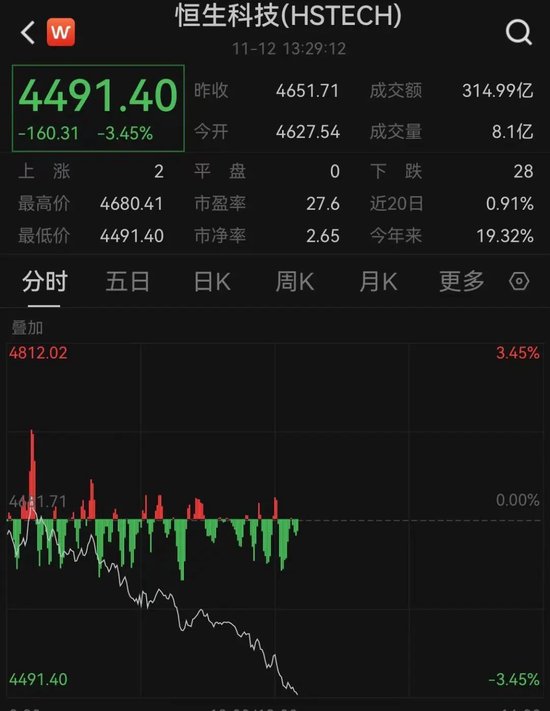午后,恒指短暂跌穿20000点大关,跌逾2%,此外,恒生科技指数也跌幅扩大。